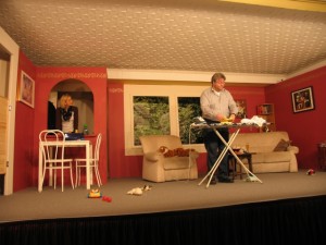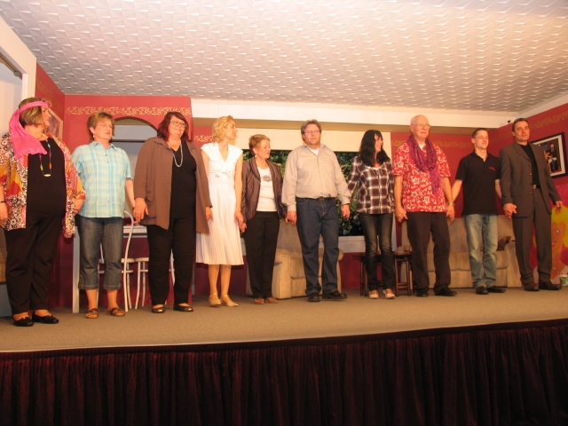 Hier gibt es für den geplagten Ehemann nur noch eine Lösung: Mord oder Auszug! Dieses Boulevard-Stück ist nicht nur bravourös gespielt sondern macht durch seinen ernsten Hintergrund nachdenklich: Während die Ehefrau 20 Jahre im Haus ihre Pflichten ohne interessante Kontakte, ohne geistige Anregung und ohne Anerkennung von außen erledigt hat (M M = Mutti mausgrau), dreht der Ehemann bereits nach 10 Tagen durch. Verstärkt wird das Ensemble durch Petra Böcher (Souffleuse) sowie Michael Schneider, Christian Brüll und Pascal Krysmann (Technik).