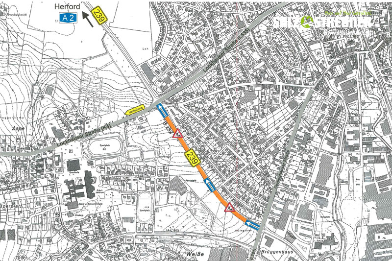 Der in Fahrtrichtung A 2 (Herford) fahrende Verkehr verbleibt auf der B 239 (Einbahnstraßenregelung). Die weiteren Verkehrsführungen 4 bis 6 werden in der Presse rechtzeitig bekanntgegeben.