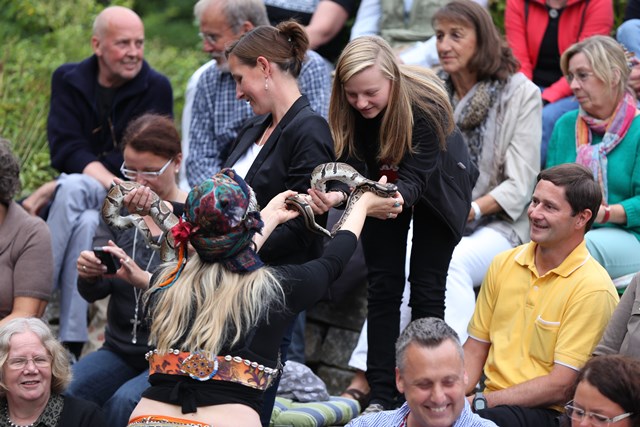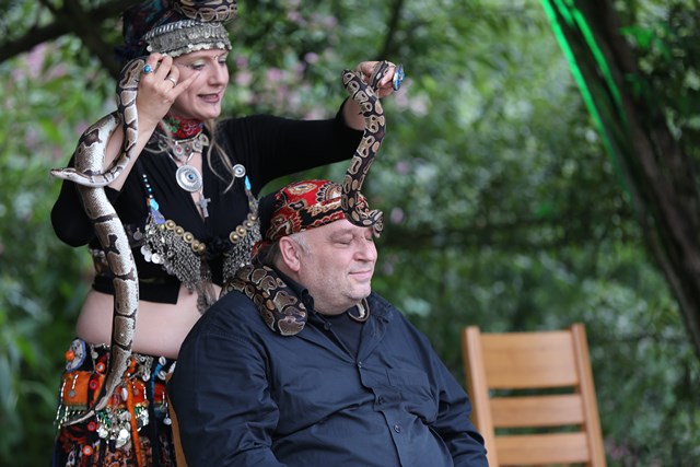 Denn bevor es richtig losging, wurde der Salzufler Autor selbst zum Opfer eines „Angriffs”. Die Bauchtänzerin Ladina El Farah betörte ihn dermaßen, dass er sich anschließend fast wehr- und regungslos mit lebenden Schlangen dekorieren ließ.