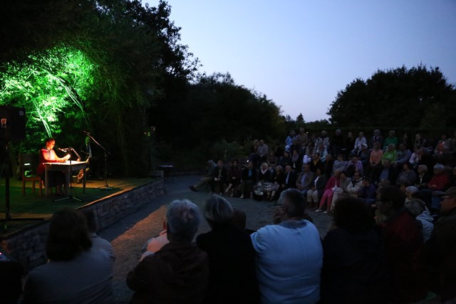 Nach Jürgen Kehrer betrat seine Ehefrau Sandra Lüpkes die Naturbühne des Umweltzentrums. Die aus Ostfriesland stammende Wahl-Münsteranerin musste dem Publikum nicht vorgestellt werden, war sie doch schon einige Male in Bad Salzuflen (u. a. im Mühlencafé und im Bahnhof) zu Gast. Ihre Episode „Der Schatz im Aasee”, entnommen aus dem „Westfälischen Mordkompott”, beschrieb eine skurrile Mann-Frau-Mann-Beziehung, in der einer einfach zu viel ist. Ganz nebenbei verriet Lüpkes, was der Buchstabe „i” aus einem Schatz machen kann.