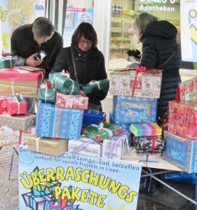 „Wir freuen uns natürlich über diesen großen Erfolg“, sagt Stephanie Wittmann, derzeit Präsidentin des Frauenclubs. Zwei Wochen lang waren Frauen des Inner Wheelclubs von Geschäft zu Geschäft gegangen, um die Einzelhändler in Bad Salzuflen für ihr Projekt zu gewinnen. Waren oder Gutscheine im Wert von 20 Euro sollten die angesprochenen Geschäftsleute für einen guten Zweck spenden und in Überraschungspakete verpacken. Diese verkauften die Mitglieder des IWC dann für 10 €. Viele der angesprochenen Inhaber der Geschäfte waren laut einer Pressemitteilung gerne bereit, auch mehrere Pakete zu spenden. „Eine Aktion die sich gelohnt hat und die in diesem Jahr unter anderem zwei bedürftigen Familien zugute kommt“, heißt es.