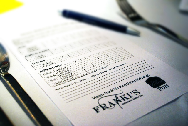 Auf jedem Platz der Gäste lag ein Bewertungsbogen, auf dem die Gäste die Leistungen in den Disziplinen „Service“, “Qualität der Getränke“, „Dekoration“ und „Qualität der Speisen“ bewerten konnten.
