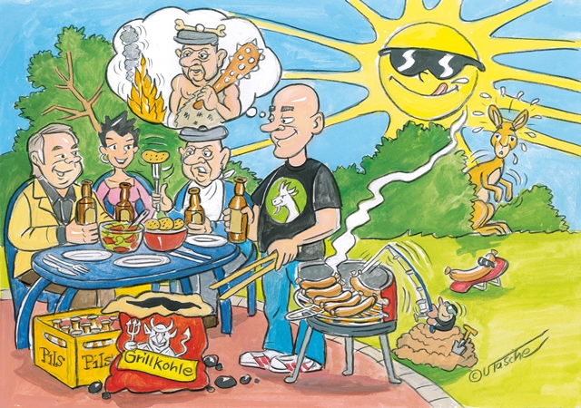 Oppa Rübenstrunk setzt wie immer noch einen drauf: „Und chanz früha ham wer Kartoffelschalen ins Feuer cheworfen und chewartet, bis die Schale verkokelt ist. Leckerer schmeckt kein totes Käncheruhfleisch, dasse chetz bei Lidl verhökern, sach ich euch. Und heute? Mein Schwiechersohn hat chetz son Weber-Dingens. Hei Teck! Weiße was der kostet? Demnäxt musser noch sein Daimler verkaufen!”