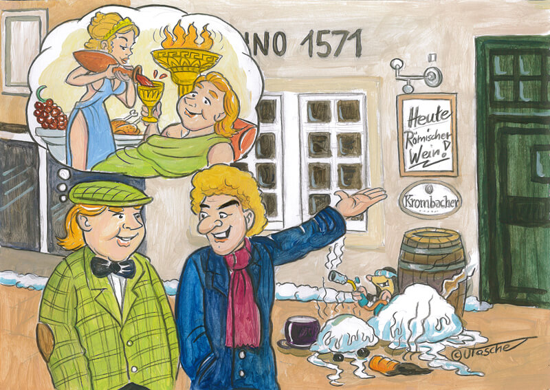 „Aber vom Trinken. Bei den letzten Buddelarbeiten hat man nämlich einen römischen Kelch gefunden. Genau hier! Unterm Rathausplatz!“ „Und was sagt uns das?“ „Dass hier schon immer heftig gebechert wurde, getreu em Studentenmotto: Esst und trinkt, in ferner Zukunft wird es keine Gelage mehr geben! Und wenn wir schon bei den Römern sind. Auf dem Kelch stand eingeritzt: Finis coronat opus – Das Ende krönt das Werk! Passt, oder?“