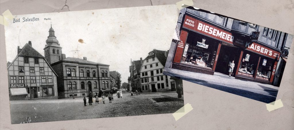 Unternehmensname und -geschichte gehen dabei tatsächlich auf den späteren Namen Kaiser’s Kaffee zurück, denn ab 1882 wurde in Viersen Kaffee geröstet, was die Hausfrauen vor der Jahrhundertwende meist noch selbst zu Hause erledigen mussten. 1885 wurden die ersten drei Filialen gegründet, 1887 sogar eine in der damaligen Reichshauptstadt Berlin. Im Jahr 1900 wurde schon die 500. Filiale eröffnet, ab 1904 erhielt die Firma das Logo mit dem Kaffeekannengesicht. Vermutlich lässt sich die erste Niederlassung von Kaiser’s Kaffee am Markt in Bad Salzuflen auf vor 1904 datieren, wie die oben gezeigte, und 1908 gestempelte Karte belegt.
