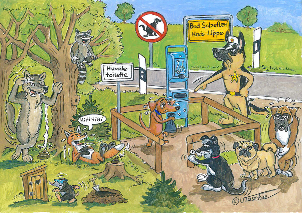 „Ohne Hunde geht Bad Salzuflen jedenfalls vor die Hunde!“, findet auch Balthasar, dessen Terrasse samt Wiese ab sofort für asylsuchende Hunde eröffnet ist. Bis die Verwaltenden sich erbarmen und die dann endlich autofreie Innenstadt zur Hundeweise erklären. Parkhäuser und nette Toiletten gibt’s da übrigens auch genügend.