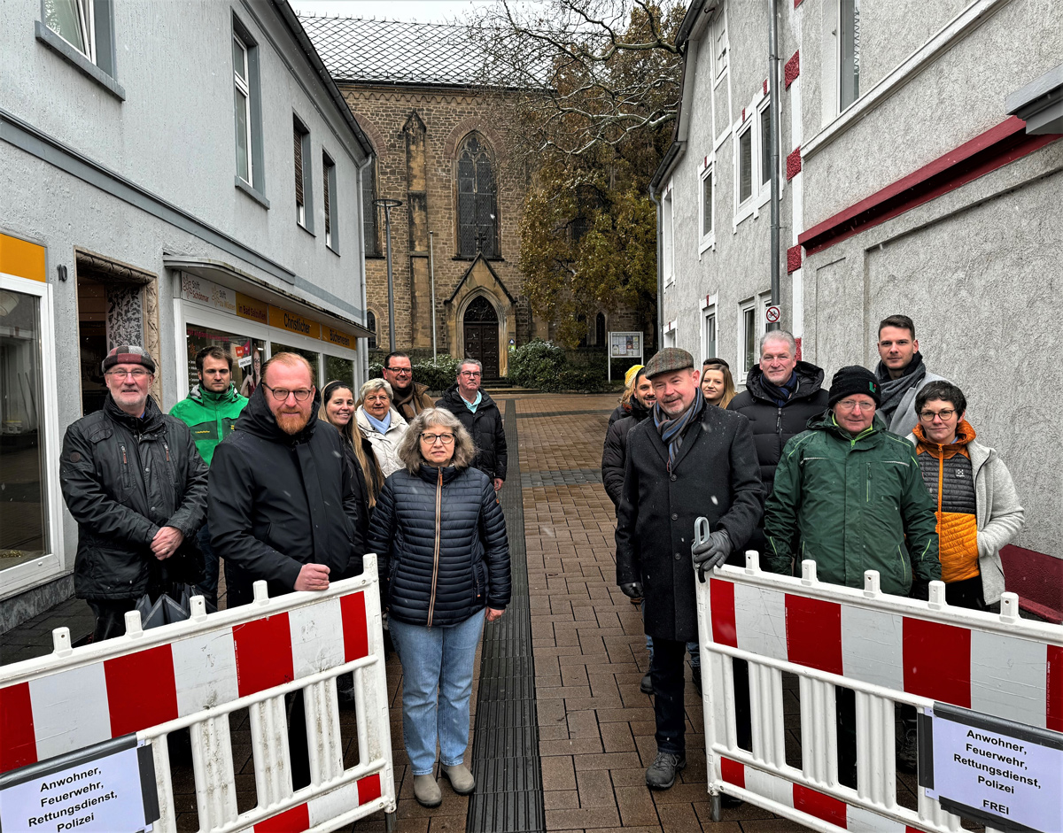 Bad Salzuflen (06. Dezember 2023). Das lange Warten hatte endlich ein Ende: Nach einem Jahr Bauzeit wurde der umgestaltete Kirchplatz im Bad Salzufler Ortsteil Schötmar am heutigen Mittwoch (06. Dezember 2023) eröffnet. Ab 11 Uhr versammelten sich bei winterlichen Witterungsbedingungen geladene Gäste aus der Politik und Gesellschaft sowie die an der Planung und Umsetzung Beteiligten. „Die Freude und große Zustimmung über das Ergebnis des umfangreich neugestalteten Kirchplatzes ist allen Anwesenden anzusehen“, sagte Bernd Zimmermann, Technischer Beigeordneter der Stadt Bad Salzuflen, in seiner Begrüßungsrede. Vor genau einem Jahr, ebenfalls am Nikolaustag, startete mit einem symbolischen Spatenstich die Neugestaltung des Kirchplatzes als erste bauliche Maßnahme gestartet im „Masterplan Schötmar“. In diesen zwölf Monaten wurden von der etwa 2800 Quadratmeter umfassenden, begehbaren Fläche rund 1800 Quadratmeter gepflastert, davon sind 1000 Quadratmeter mit einer wasserdurchlässigen Decke versehen.