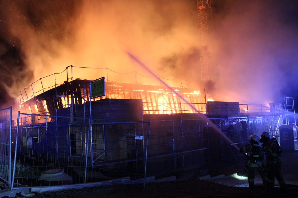 Bei Eintreffen der Einsatzkräfte stand das Objekt, bei dem es sich um einen Rohbau handelt, bereits in Vollbrand. Von mehreren Seiten schlugen die Flammen aus dem Gebäude. Die enorme Hitzestrahlung hatte bereits ein Baustellenfahrzeug massiv beschädigt. Fenster platzten und die Verkleidung schmolz. Auch der Kran der Baustelle litt unter der Hitzeeinwirkung und wurde als potenziell umsturzgefährdet identifiziert. In zwei Einsatzabschnitten ging die Feuerwehr mit mehreren Löschangriffen von unterschiedlichen Seiten zur Brandbekämpfung vor. Ein vollständiges Ausbrennen des Baustellenfahrzeuges konnte so verhindert werden, ebenso ein Umstürzen des Baustellenkrans. Nach circa einer halben Stunde war das Feuer unter Kontrolle. Die Nachlöscharbeiten beschäftigten die rund 45 Einsatzkräfte jedoch bis in den Donnerstagmorgen. Ein Fachberater des Technischen Hilfswerks ist zur Unterstützung der Nachlöscharbeiten angefordert worden. Das THW musste jedoch nicht mehr tätig werden. Verletzt wurde bei dem Brand niemand. Für die Dauer des Einsatzes war der Elkenbreder Weg voll gesperrt. Zur Brandursache und Schadenshöhe hat die Polizei die Ermittlungen aufgenommen.