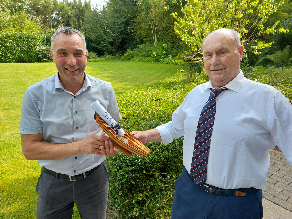 Bad Salzuflen (09. September 2024). Das kleine Modell-Ruderboot steht sinnbildlich für zwei Herzensangelegenheiten von Hans-Georg Wüllner, dem Begründer der Mineralwassermarke Carolinen: Das Meer mit seiner Weite und den Bad Salzufler Kurparksee mit seinem Ambiente. Deshalb hat der frühere Unternehmer, der seit über zehn Jahren in der Badestadt lebt, zu seinem 90. Geburtstag der Stadt ein besonderes Geschenk gemacht. 9.000 Euro spendete er für erholungsfördernde Maßnahmen am großen Kurparksee. Als „nicht nur eine sehr schöne Geste, sondern vor allem ein deutliches Zeichen der Verbundenheit mit unserer Stadt“ beschrieb Bürgermeister Dirk Tolkemitt diesen Schritt des Jubilars – „zumal das Geld indirekt allen Einwohnern und Gästen in Form von Maßnahmen zugutekommen wird.“
